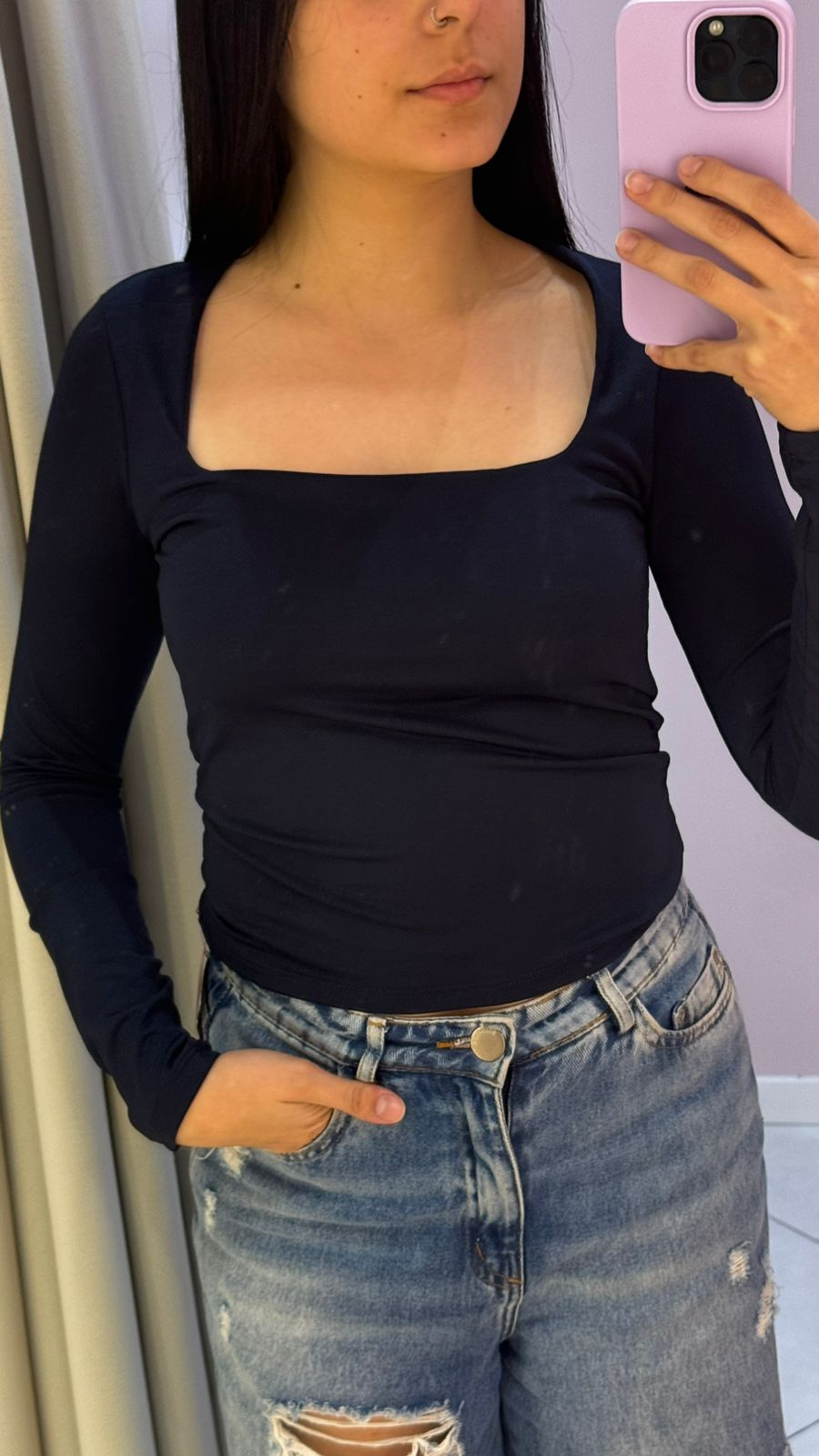 A Blusa com Decote Quadrado é a união perfeita entre elegância e tendência. Seu design clássico valoriza o colo com sofisticação, enquanto as linhas retas trazem um toque moderno e minimalista ao visual.