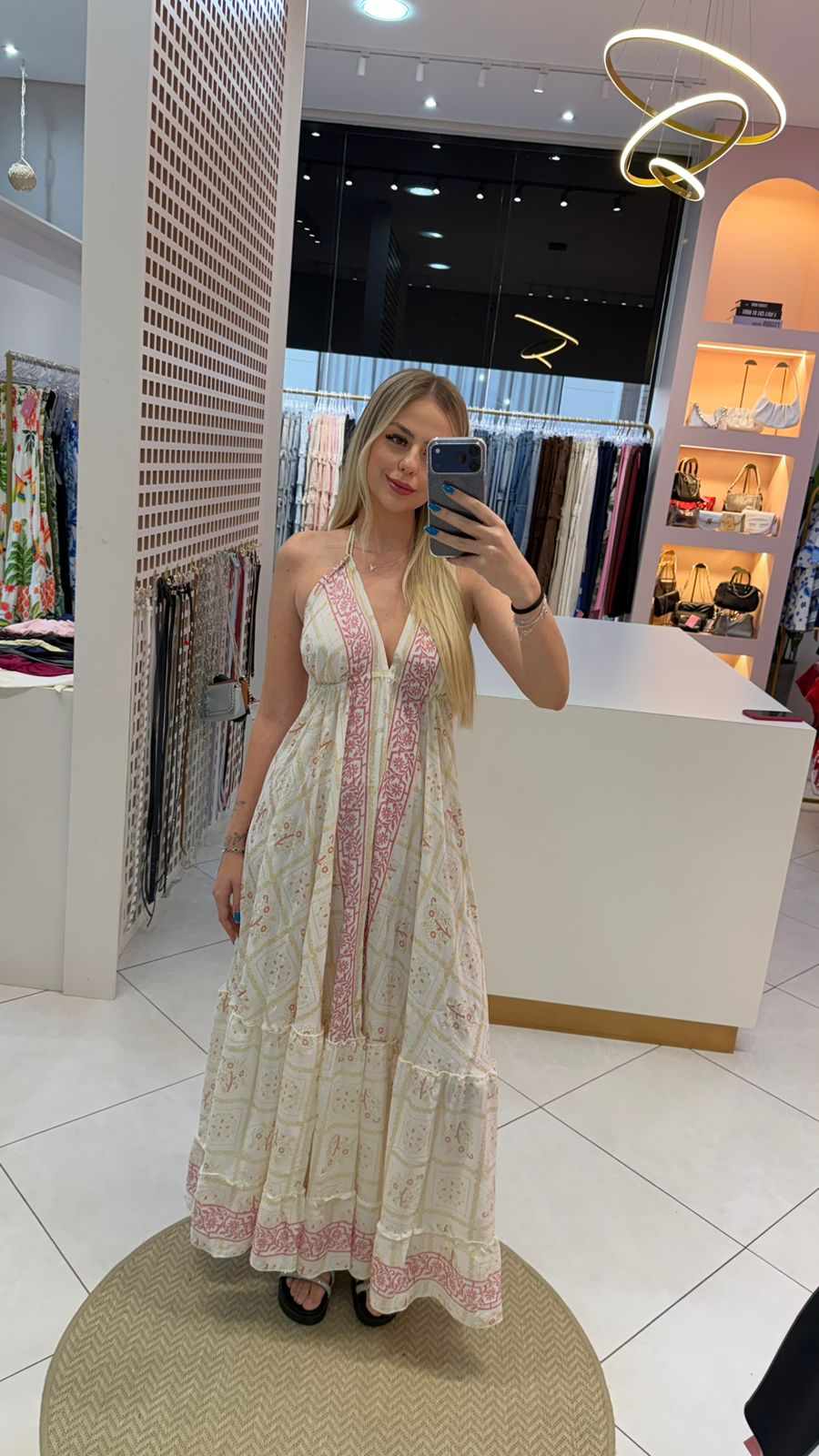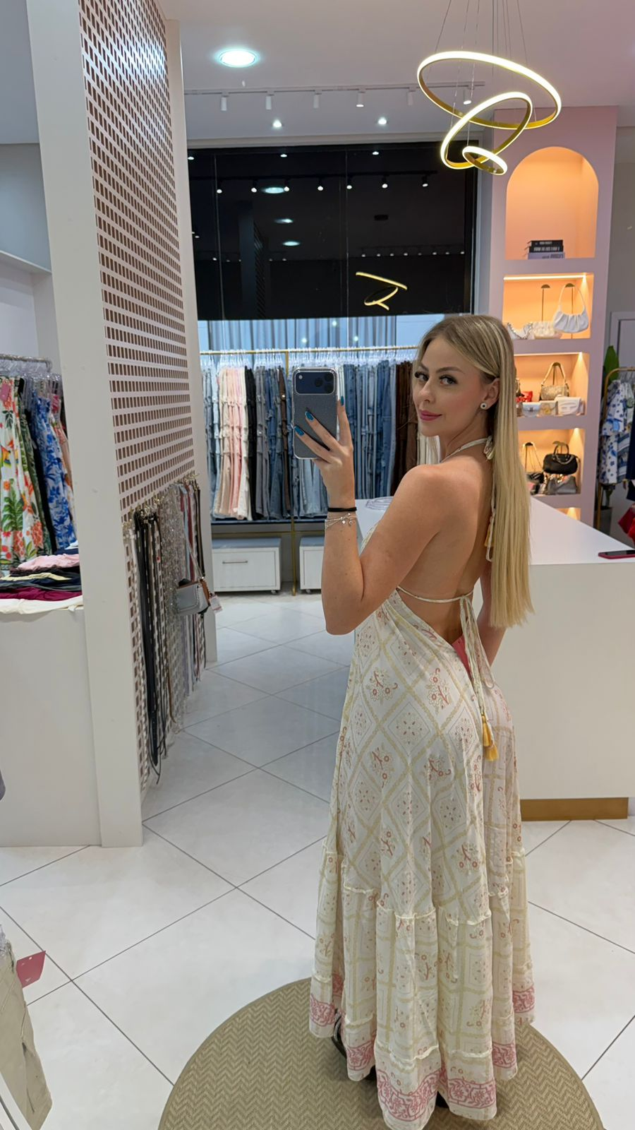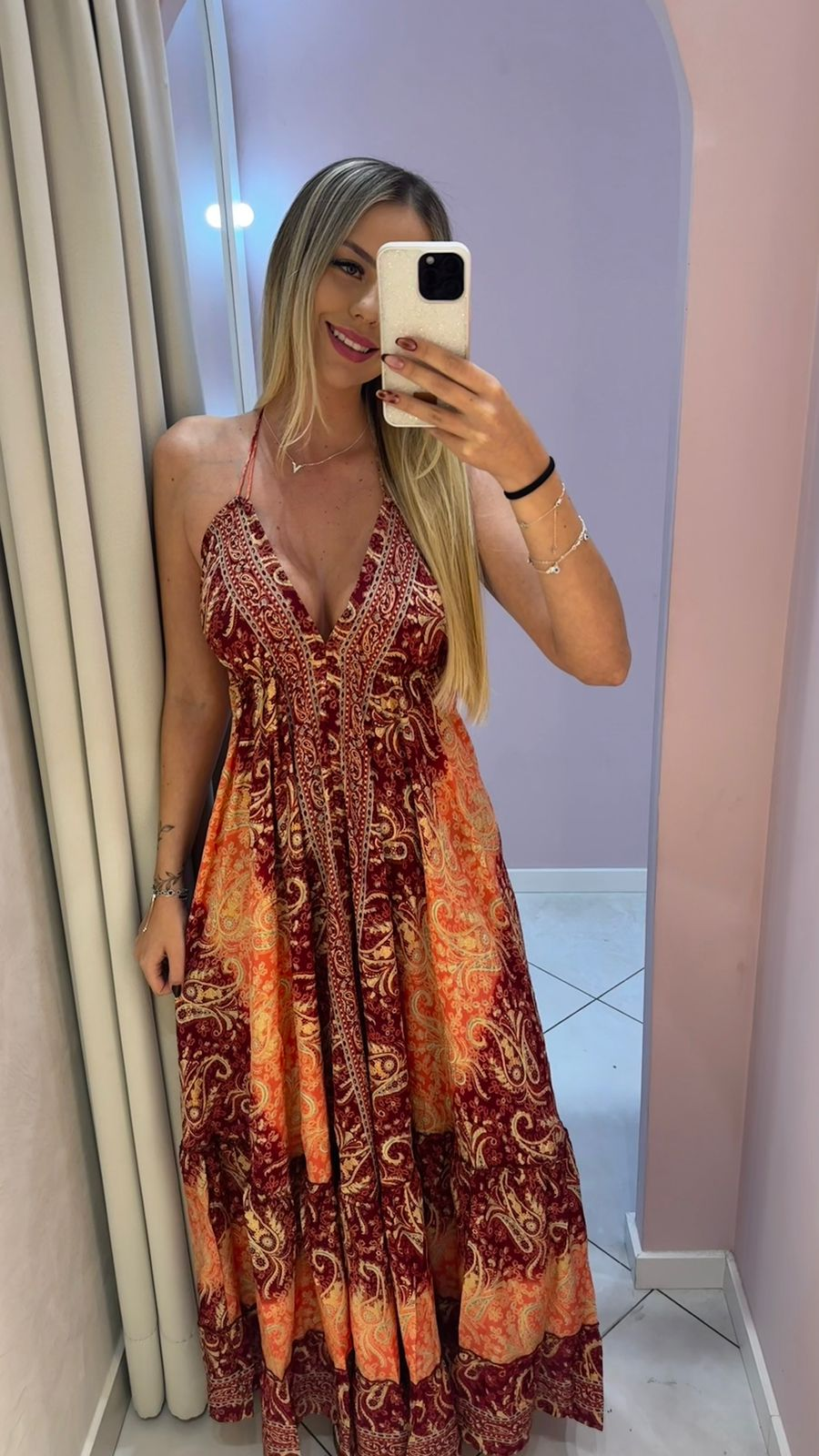 A modelagem fluida proporciona conforto e movimento, tornando este vestido perfeito para eventos especiais, viagens, produções boho-chic e looks de verão sofisticados.