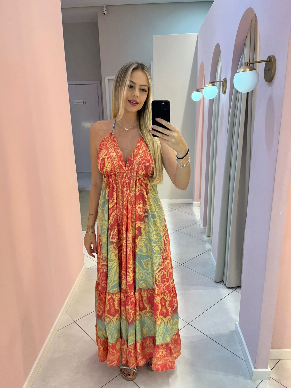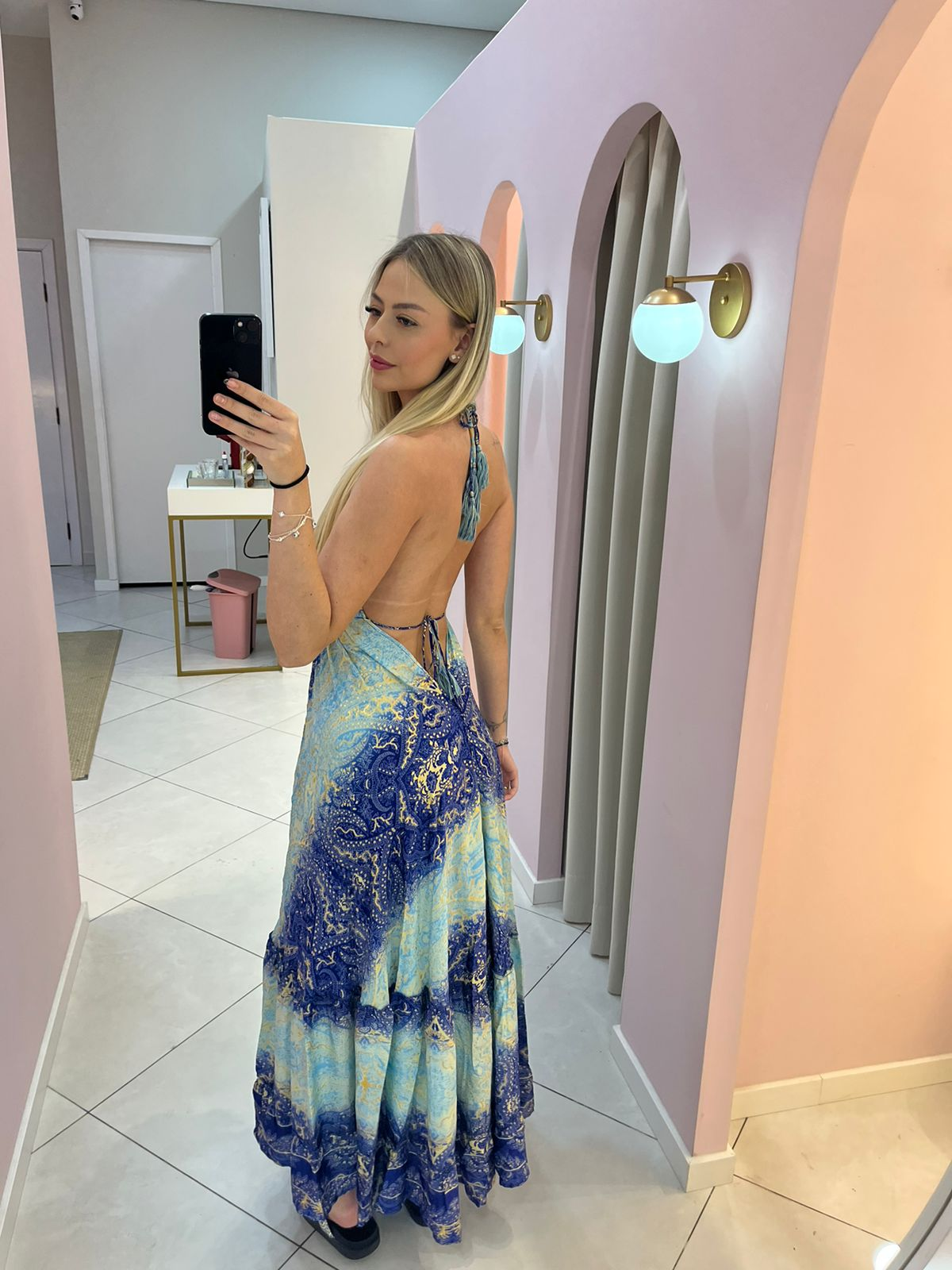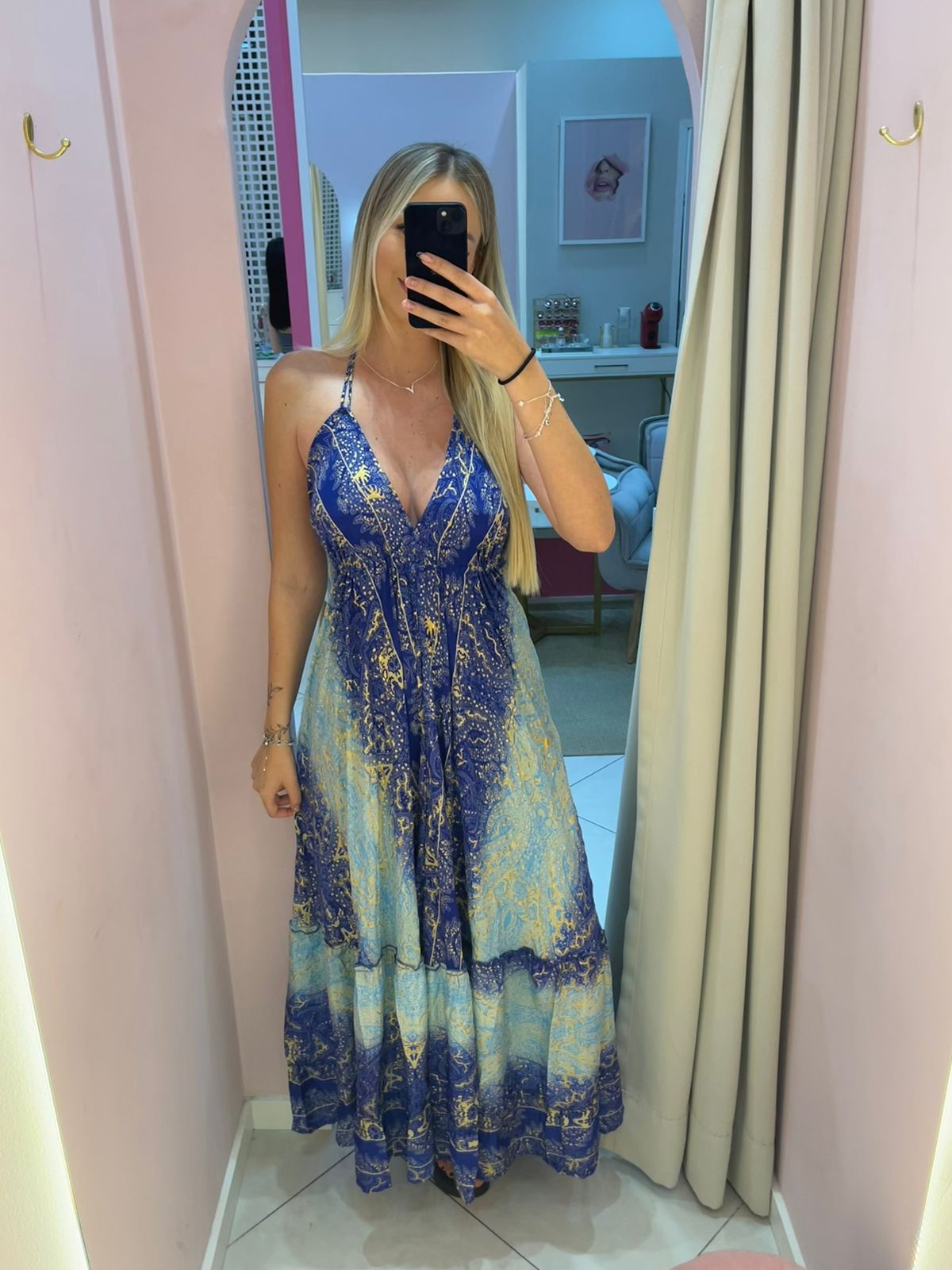 A modelagem fluida proporciona conforto e movimento, tornando este vestido perfeito para eventos especiais, viagens, produções boho-chic e looks de verão sofisticados.